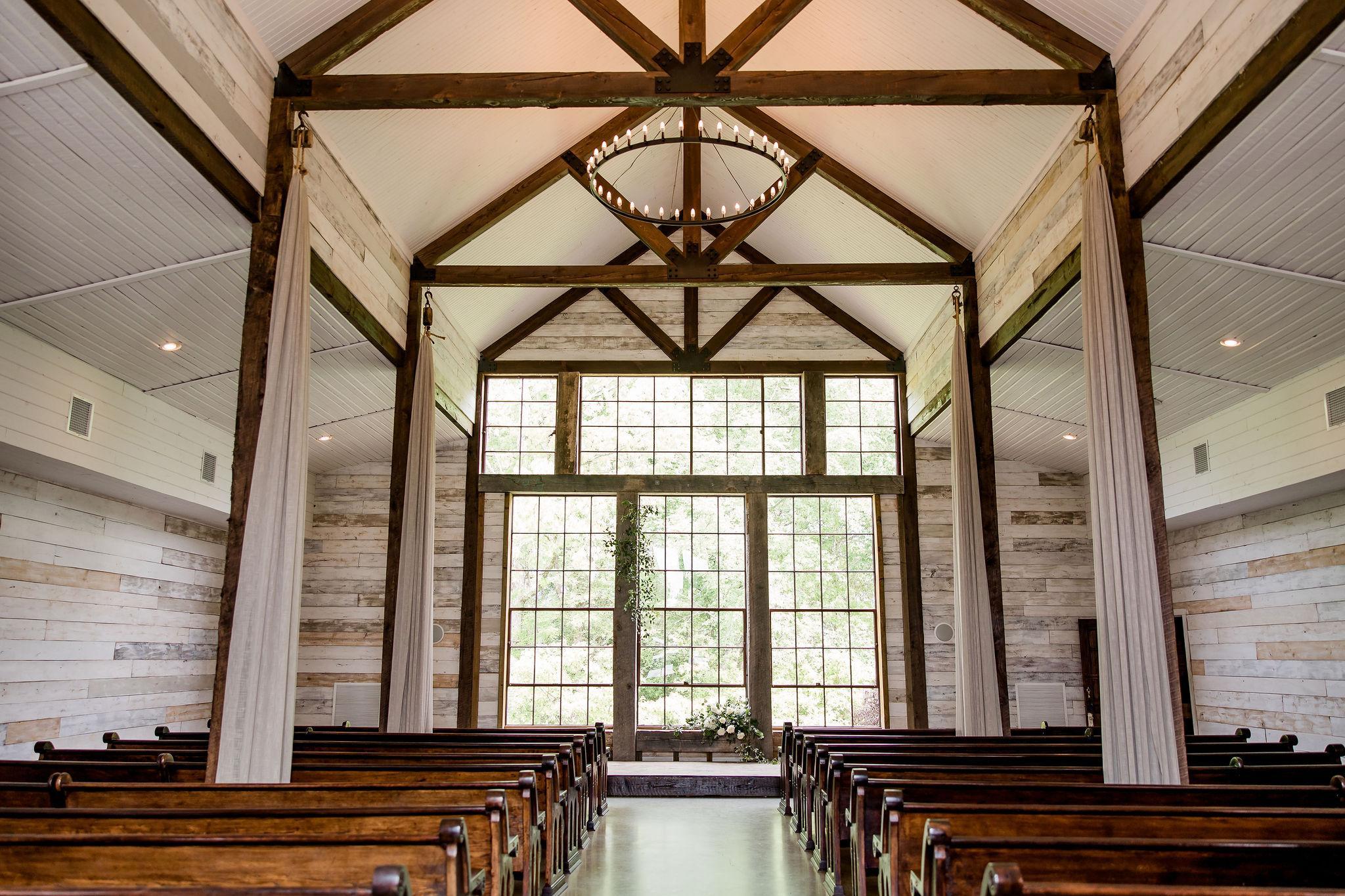 The chapel at Big Sky Barn features more than 3,000 square feet of climate-controlled space – dedicated solely to your ceremony. The walls of the chapel are solid oak planks, handpainted on-site for an antiqued whitewashed appeal. Your ceremony will be backed by a 26-foot-tall wall of antique windows framed by oak beams, uniting the inside with the great outdoors. With architectural details around every corner, there is no shortage of photo opportunities here.